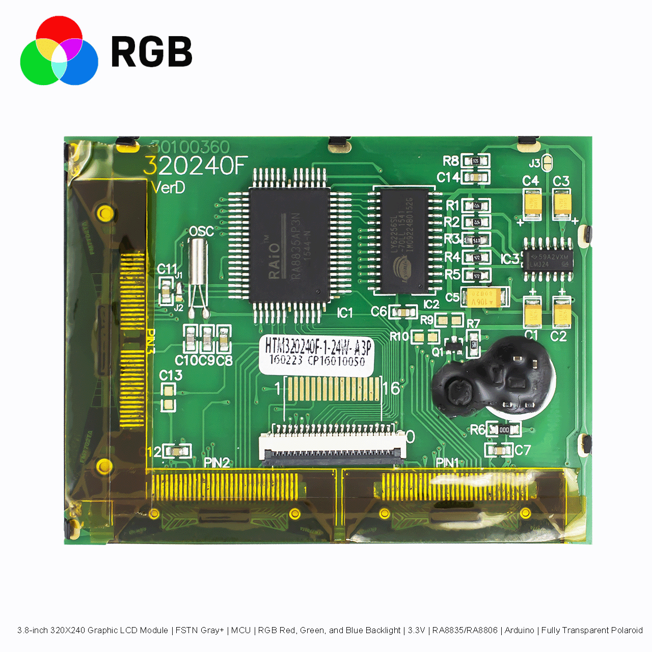3.8-inch 320X240 Graphic LCD Module | FSTN Gray+ | MCU | RGB Red, Green, and Blue Backlight | 3.3V | RA8835/RA8806 | Arduino | Fully Transparent Polaroid